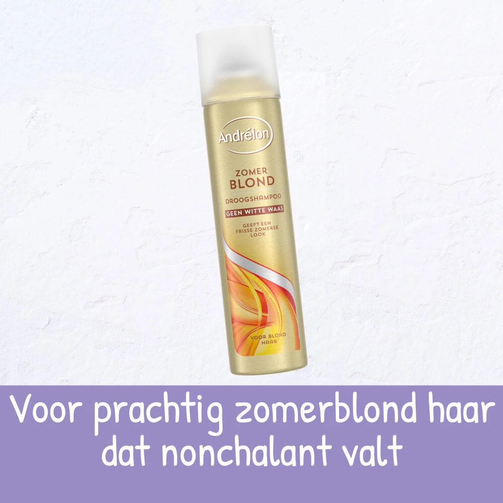 Andrélon Zomerblond DroogshampooDe Zomer Blond droogshampoo is speciaal voor normaal tot vet haar dat tussen de wasbeurten door wel een flinke opfrisser kan gebruiken. Maar het product is niet alleen geschikt voor een verfrissende boost tussen de wasbeurten door, het kan ook gebruikt worden als stylingsproduct. De formule zorgt ervoor dat het vet bij de haaraanzet opgenomen wordt, op deze manier voelt het haar weer schoon en gewassen aan. Na het gebruik van de droogshampoo heeft je haar weer zi