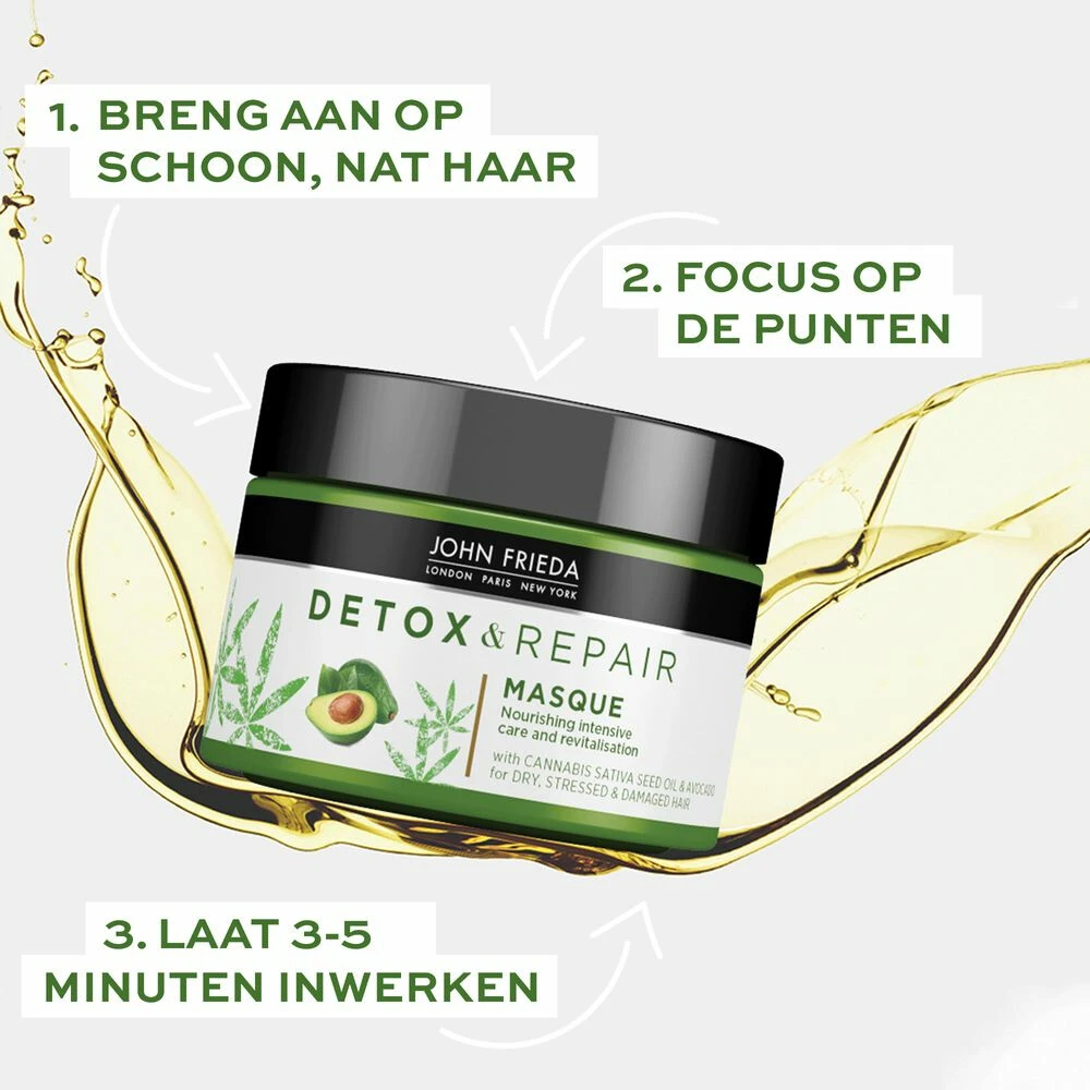 John Frieda Detox & Repair MasqueJohn Frieda Detox & Repair Masker is speciaal ontwikkeld voor droog, gestresst of beschadigd haar. Dit masker, verrijkt met cannabis sativa zaad olie & avocado, biedt intensieve hydratatie en diepe verzorging voor gezond ogend haar. Voor zichtbaar hersteld en zacht haar. Is speciaal ontwikkeld voor droog of beschadigd haarVerrijkt met avocado-olie en groene thee-extract transformeert je haar tot gezond ogend haar met meer volume en een zach