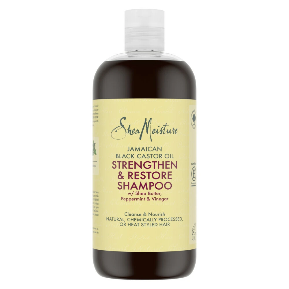 SheaMoisture Jamaican Black Castor Oil Strenghten & Restore ShampooSheaMoisture Jamaican Black Castor Oil Strengthen & Repair Shampoo voor krullend haar is ontworpen om beschadigd of chemisch behandeld haar te versterken en te voeden.Deze shampoo is verrijkt met sheaboter en Jamaicaanse zwarte castorolieVerwijdert opbouw van haarproducten, zonder de hoofdhuid uit te drogenOntworpen om beschadigd haar en chemisch behandeld haar te versterkenDeze reinigende shampoo is siliconenvrij en sulf